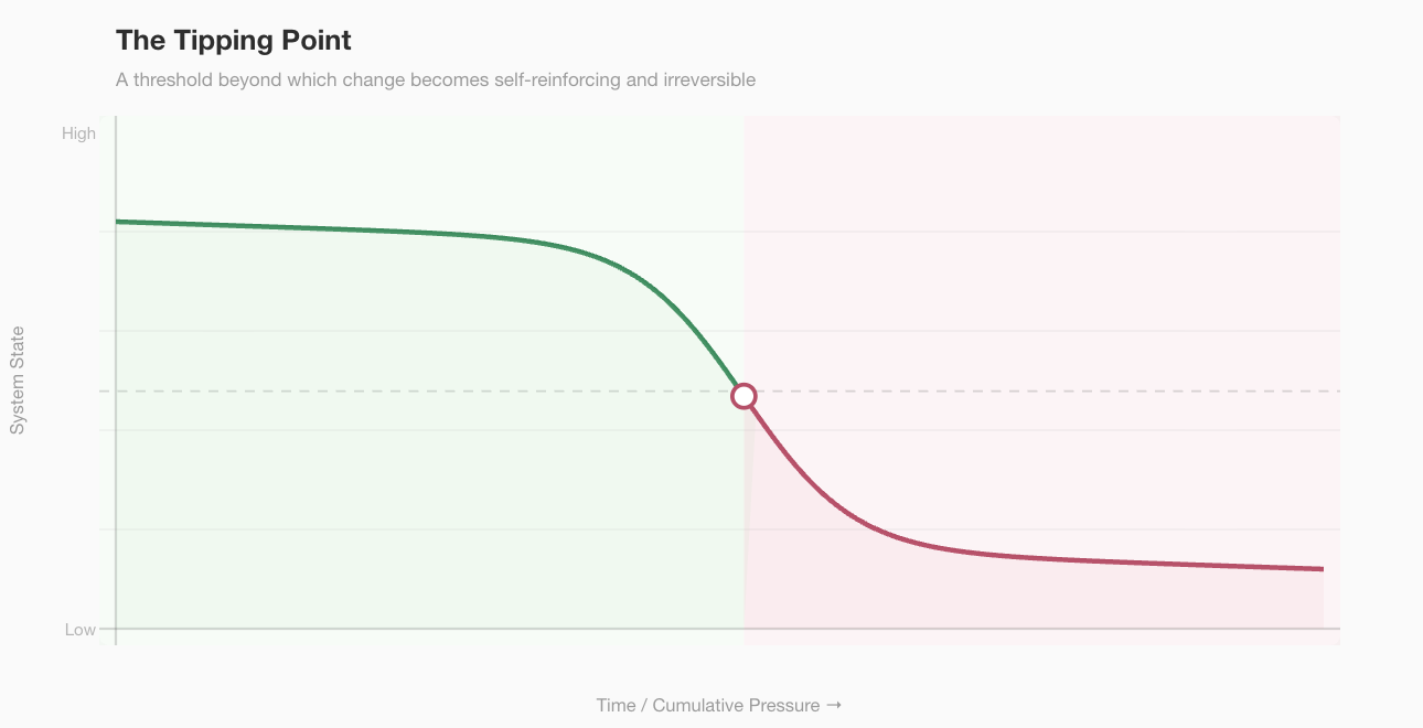Ecosystems can absorb pressure for decades while appearing relatively stable, then cross a threshold, also called a “tipping point” in environmental science, beyond which they shift rapidly and irreversibly into a different state. This non-linearity means that extrapolating from current trends is often inconclusive.