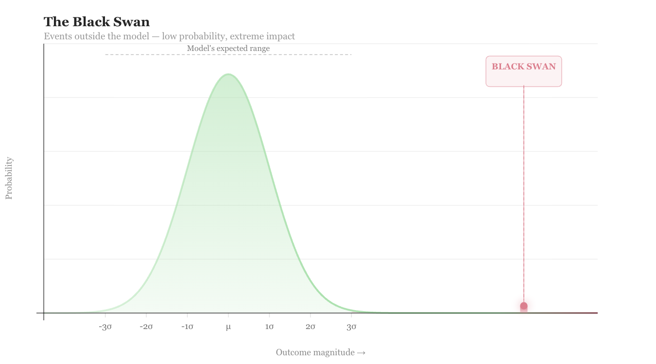 A related but distinct concept is that of black swan event - popularized by Nassim Nicholas Taleb, the idea of black swan refers to an event which is prospectively unpredictable - basically, it lies outside of the model, or unknown unknowns.